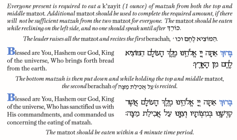 A k’zayit (1 ounce) of matzah from both the top and middle matzot should be taken and given to everyone. (A manual scale may be used to measure the matzah.). If possible, one should eat both k’zaytim at once, chewing them together and then swallowing one k’zayit at a time. If this is not possible, he may eat a k’zayit first from the top matzah and then a k’zayit from the middle matzah. (Please refer to the chart on page 78.)