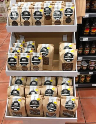 A display of Baked by Bibis brittle displayed at Kosher Kingdom in Miami, Florida.