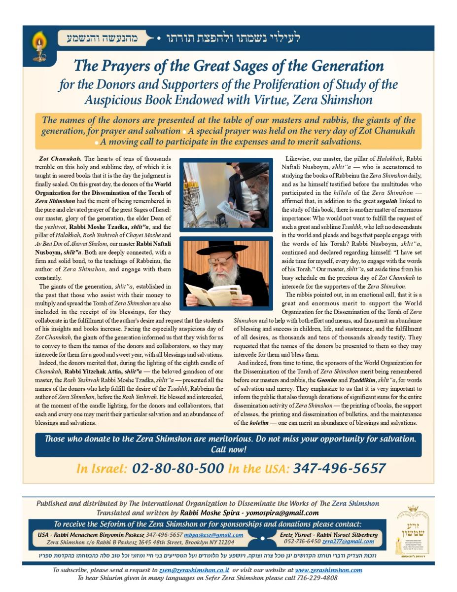 Zera Shimshon - Rabbi Shimshon Chaim ben Rabbi Nachman Michal Nachmani, was a Rabbi of four large communities throughout Italy and in his end of life in the city Reggio Emilia. Rabbi Shimshon Chaim 'Niftar' in the year 1779 in the city Reggio in Itlay. During his funeral, there were many words of praise, not just in his erudition of Torah, but on his love for the Jewish people. The communities in Italy and abroad considered Rabbi Shimshon Chaim their Rebby. Major Rabbis in his generation, wrote amazing things in his honor and wisdom. Including One of the outstanding rabbis figures the 'Hida' (Rabbi Haim Yosef David Azulai ben Rabbi Rephael Yitzhak Zerachia) had testify on Rabbi Shimshon Chaim praise in 'Kedushah' and wisdom and also knowledge in studying 'Kabala' and practical 'Kabala'. Rabbi Shimshon Chaim lived in 'Or ha-Ḥayyim' 'Hakadosh' (Rabbi Chaim ben Atar ben Rabbi Moshe) era, and was in friendship with him. Rabbi Shimshon Chaim had only one child, a son, who died at a young age. Upon this Rabbi Shimshon Chaim decided to dedicate his 'Sefarim' to the memory of this child who had no continuity of a family. In the beginning of his book Rabbi Shimshon Chaim wrote that he need to leave some memory in this world because he has no continuity. And that’s why he wrote the book and named it: "Zera Shimshon", means the Seed of Shimshon. Rabbi Shimshon Chaim publish the book one year before he died. Rabbi Shimshon Chaim placed a lot of his energy, during his lifetime that people should learn from his ''Sefarim''. Rabbi Shimshon Chaim also emphasized, that after his 'Neshama', will leave this world that people should continue to learn from his ''Sefarim''. What is most unusual for a Tzadik of this stature, was that he made a promise. That promise is that anyone that takes upon himself to learn from his writing, he promises "children, praise, health, 'Parnasa', wealth, honor".