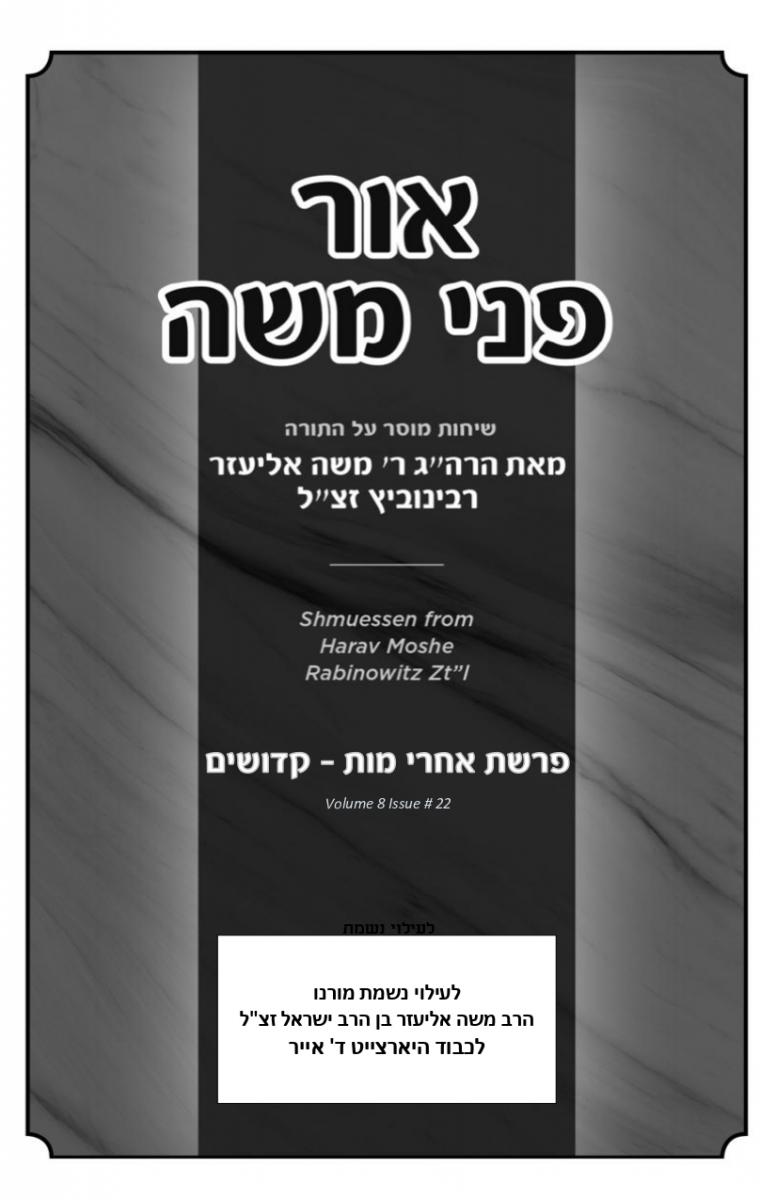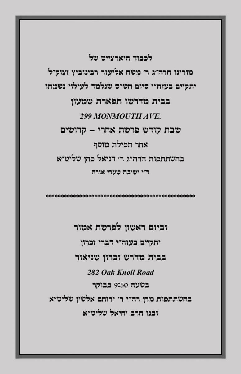 Hagaon Rav Moshe Eliezer Rabinowitz zt”l, was the menahel of Mesivta Keren Hatorah in Lakewood and rov of Bais Medrash Tiferes Shimon.