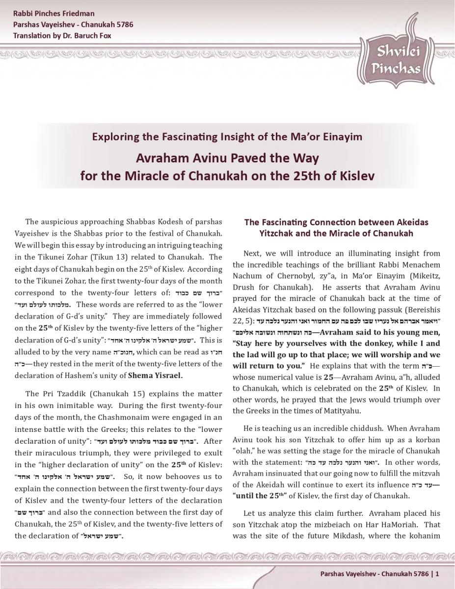 Avraham Avinu Paved the Way for the Miracle of Chanukah on the 25th of Kislev