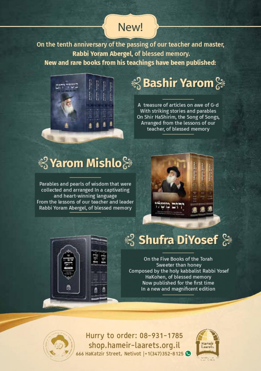 Rabbi Israel Abargel and Hameir Laarets work to spread Torah in Israel and around the world. Their activities include classes, lectures, and daily support and assistance to those in need. Hameir Laarets is a Torah Institute that deals with the publication and distribution of the works and teachings of Rabbi Yoram Michael Abargel zt”l. Hameir Laarets has already released over 50 books and more than 100,000 copies of our publication “Mesillot” are distributed free of charge every week. Our organization also provides daily support and assistance to those in need. Rabbi Yoram Michael Abergel, OB”M was the founder and head of Torah and Hessed institutions called Kol Rina Rav Phelim and Rav Phelim whose center is currently in Netivot . Over 4,000 Avrach scholars study in these institutions. He is the author of: - Bezur Yarom - his lessons on Sefer HaTanya, - Amri Noam - his lessons on the Parshiyot of the week and the festivals of Israel - Kol Rina - prayer arrangement and cycle series