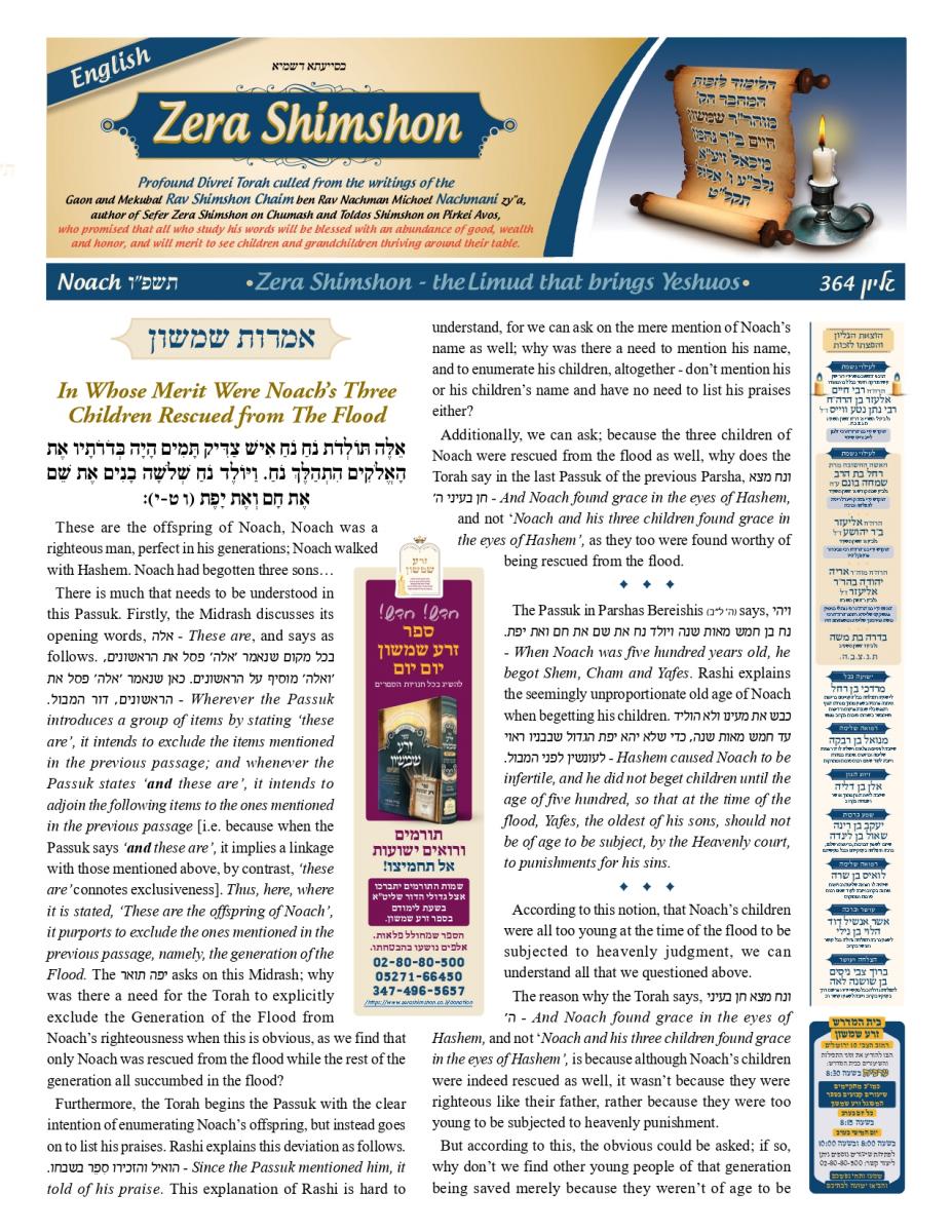 In Whose Merit Were Noach’s Three Children Rescued from The Flood