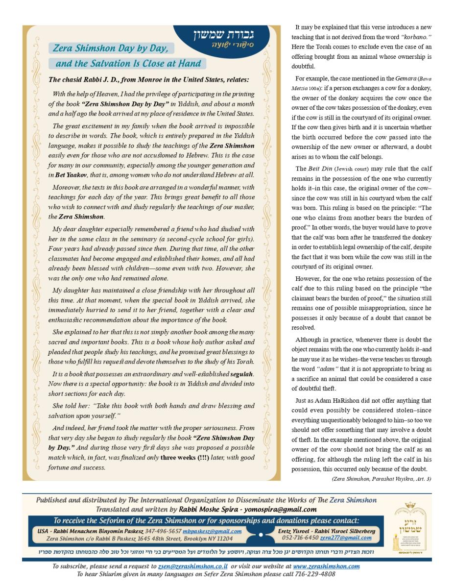 Zera Shimshon - Rabbi Shimshon Chaim ben Rabbi Nachman Michal Nachmani, was a Rabbi of four large communities throughout Italy and in his end of life in the city Reggio Emilia. Rabbi Shimshon Chaim 'Niftar' in the year 1779 in the city Reggio in Itlay. During his funeral, there were many words of praise, not just in his erudition of Torah, but on his love for the Jewish people. The communities in Italy and abroad considered Rabbi Shimshon Chaim their Rebby. Major Rabbis in his generation, wrote amazing things in his honor and wisdom. Including One of the outstanding rabbis figures the 'Hida' (Rabbi Haim Yosef David Azulai ben Rabbi Rephael Yitzhak Zerachia) had testify on Rabbi Shimshon Chaim praise in 'Kedushah' and wisdom and also knowledge in studying 'Kabala' and practical 'Kabala'. Rabbi Shimshon Chaim lived in 'Or ha-Ḥayyim' 'Hakadosh' (Rabbi Chaim ben Atar ben Rabbi Moshe) era, and was in friendship with him. Rabbi Shimshon Chaim had only one child, a son, who died at a young age. Upon this Rabbi Shimshon Chaim decided to dedicate his 'Sefarim' to the memory of this child who had no continuity of a family. In the beginning of his book Rabbi Shimshon Chaim wrote that he need to leave some memory in this world because he has no continuity. And that’s why he wrote the book and named it: "Zera Shimshon", means the Seed of Shimshon. Rabbi Shimshon Chaim publish the book one year before he died. Rabbi Shimshon Chaim placed a lot of his energy, during his lifetime that people should learn from his ''Sefarim''. Rabbi Shimshon Chaim also emphasized, that after his 'Neshama', will leave this world that people should continue to learn from his ''Sefarim''. What is most unusual for a Tzadik of this stature, was that he made a promise. That promise is that anyone that takes upon himself to learn from his writing, he promises "children, praise, health, 'Parnasa', wealth, honor".