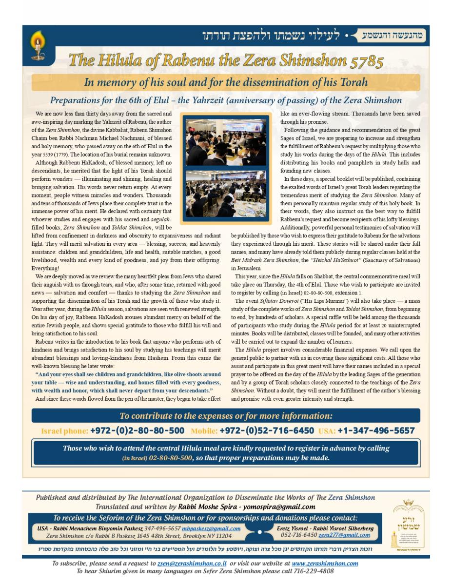 Zera Shimshon - Rabbi Shimshon Chaim ben Rabbi Nachman Michal Nachmani, was a Rabbi of four large communities throughout Italy and in his end of life in the city Reggio Emilia. Rabbi Shimshon Chaim 'Niftar' in the year 1779 in the city Reggio in Itlay. During his funeral, there were many words of praise, not just in his erudition of Torah, but on his love for the Jewish people. The communities in Italy and abroad considered Rabbi Shimshon Chaim their Rebby. Major Rabbis in his generation, wrote amazing things in his honor and wisdom. Including One of the outstanding rabbis figures the 'Hida' (Rabbi Haim Yosef David Azulai ben Rabbi Rephael Yitzhak Zerachia) had testify on Rabbi Shimshon Chaim praise in 'Kedushah' and wisdom and also knowledge in studying 'Kabala' and practical 'Kabala'. Rabbi Shimshon Chaim lived in 'Or ha-Ḥayyim' 'Hakadosh' (Rabbi Chaim ben Atar ben Rabbi Moshe) era, and was in friendship with him. Rabbi Shimshon Chaim had only one child, a son, who died at a young age. Upon this Rabbi Shimshon Chaim decided to dedicate his 'Sefarim' to the memory of this child who had no continuity of a family. In the beginning of his book Rabbi Shimshon Chaim wrote that he need to leave some memory in this world because he has no continuity. And that’s why he wrote the book and named it: "Zera Shimshon", means the Seed of Shimshon. Rabbi Shimshon Chaim publish the book one year before he died. Rabbi Shimshon Chaim placed a lot of his energy, during his lifetime that people should learn from his ''Sefarim''. Rabbi Shimshon Chaim also emphasized, that after his 'Neshama', will leave this world that people should continue to learn from his ''Sefarim''. What is most unusual for a Tzadik of this stature, was that he made a promise. That promise is that anyone that takes upon himself to learn from his writing, he promises "children, praise, health, 'Parnasa', wealth, honor".