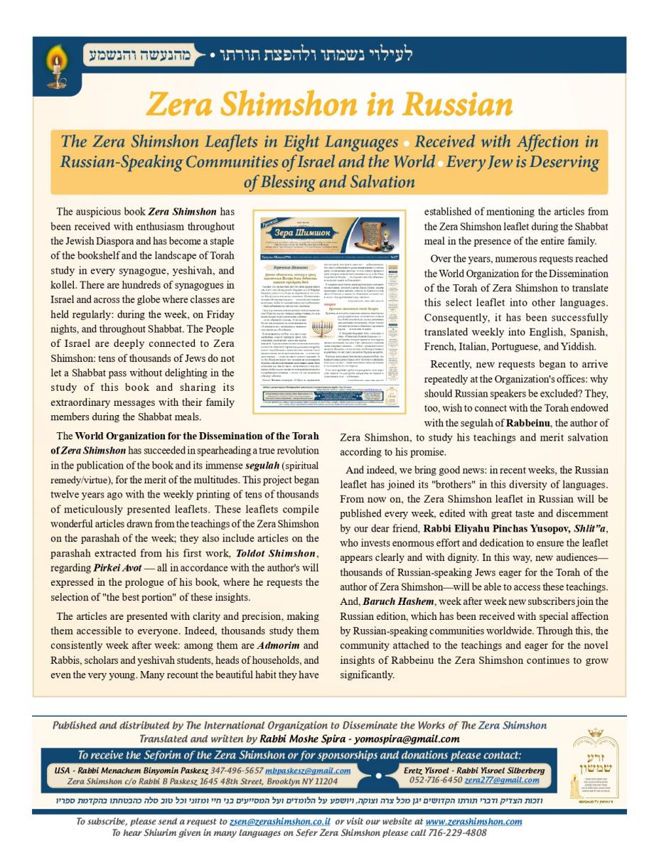 Zera Shimshon - Rabbi Shimshon Chaim ben Rabbi Nachman Michal Nachmani, was a Rabbi of four large communities throughout Italy and in his end of life in the city Reggio Emilia. Rabbi Shimshon Chaim 'Niftar' in the year 1779 in the city Reggio in Itlay. During his funeral, there were many words of praise, not just in his erudition of Torah, but on his love for the Jewish people. The communities in Italy and abroad considered Rabbi Shimshon Chaim their Rebby. Major Rabbis in his generation, wrote amazing things in his honor and wisdom. Including One of the outstanding rabbis figures the 'Hida' (Rabbi Haim Yosef David Azulai ben Rabbi Rephael Yitzhak Zerachia) had testify on Rabbi Shimshon Chaim praise in 'Kedushah' and wisdom and also knowledge in studying 'Kabala' and practical 'Kabala'. Rabbi Shimshon Chaim lived in 'Or ha-Ḥayyim' 'Hakadosh' (Rabbi Chaim ben Atar ben Rabbi Moshe) era, and was in friendship with him. Rabbi Shimshon Chaim had only one child, a son, who died at a young age. Upon this Rabbi Shimshon Chaim decided to dedicate his 'Sefarim' to the memory of this child who had no continuity of a family. In the beginning of his book Rabbi Shimshon Chaim wrote that he need to leave some memory in this world because he has no continuity. And that’s why he wrote the book and named it: "Zera Shimshon", means the Seed of Shimshon. Rabbi Shimshon Chaim publish the book one year before he died. Rabbi Shimshon Chaim placed a lot of his energy, during his lifetime that people should learn from his ''Sefarim''. Rabbi Shimshon Chaim also emphasized, that after his 'Neshama', will leave this world that people should continue to learn from his ''Sefarim''. What is most unusual for a Tzadik of this stature, was that he made a promise. That promise is that anyone that takes upon himself to learn from his writing, he promises "children, praise, health, 'Parnasa', wealth, honor".